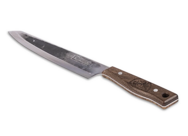 Nóż szefa kuchni o długości 20 cm i cieńszej grubości 2 mm. Dłuższe ostrze umożliwia bezproblemowe krojenie soczystego mięsa i delikatnych warzyw, takich jak szparagi. Ergonomiczna, orzechowa rękojeść zapewnia wygodny chwyt, a stalowy, nitowany uchwyt na całej długości gwarantuje stabilność.