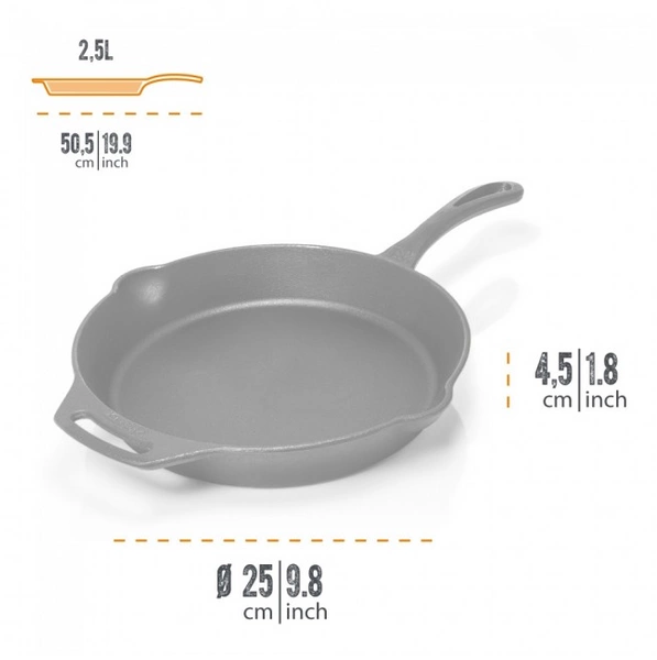 Patelnia Petromax fp30-t o masie 3,8 kg ma wysokość 6,7 cm, średnicę 30 cm, 2 boczne wylewki, długą rączkę patelni i praktyczny uchwyt, jeśli zawartość jest zbyt ciężka na jedną rękę. Ze względu na te wymiary patelnia Petromax oferuje pojemność do 2,5 l, co powinno być absolutnie wystarczające również dla większych porcji.